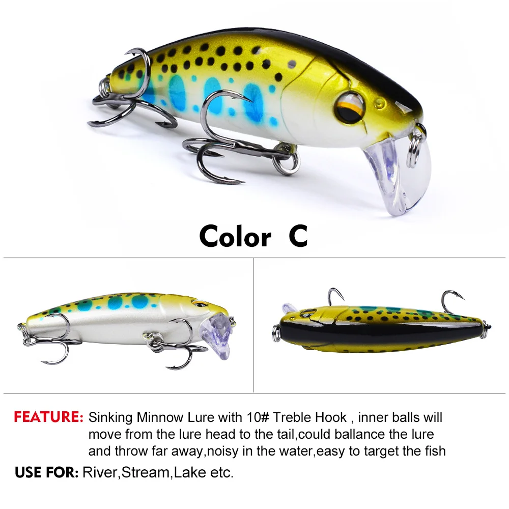 Catch more fish with this expertly engineered Sinking Minnow Lure designed for optimal performance in rivers, streams, and lakes. Featuring an internal steel ball for long casting and precision swimming action, this lure replicates the erratic motion of an injured baitfish to attract predatory species. With six vivid color options and lifelike 3D eyes, this lure is perfect for all-season freshwater fishing.