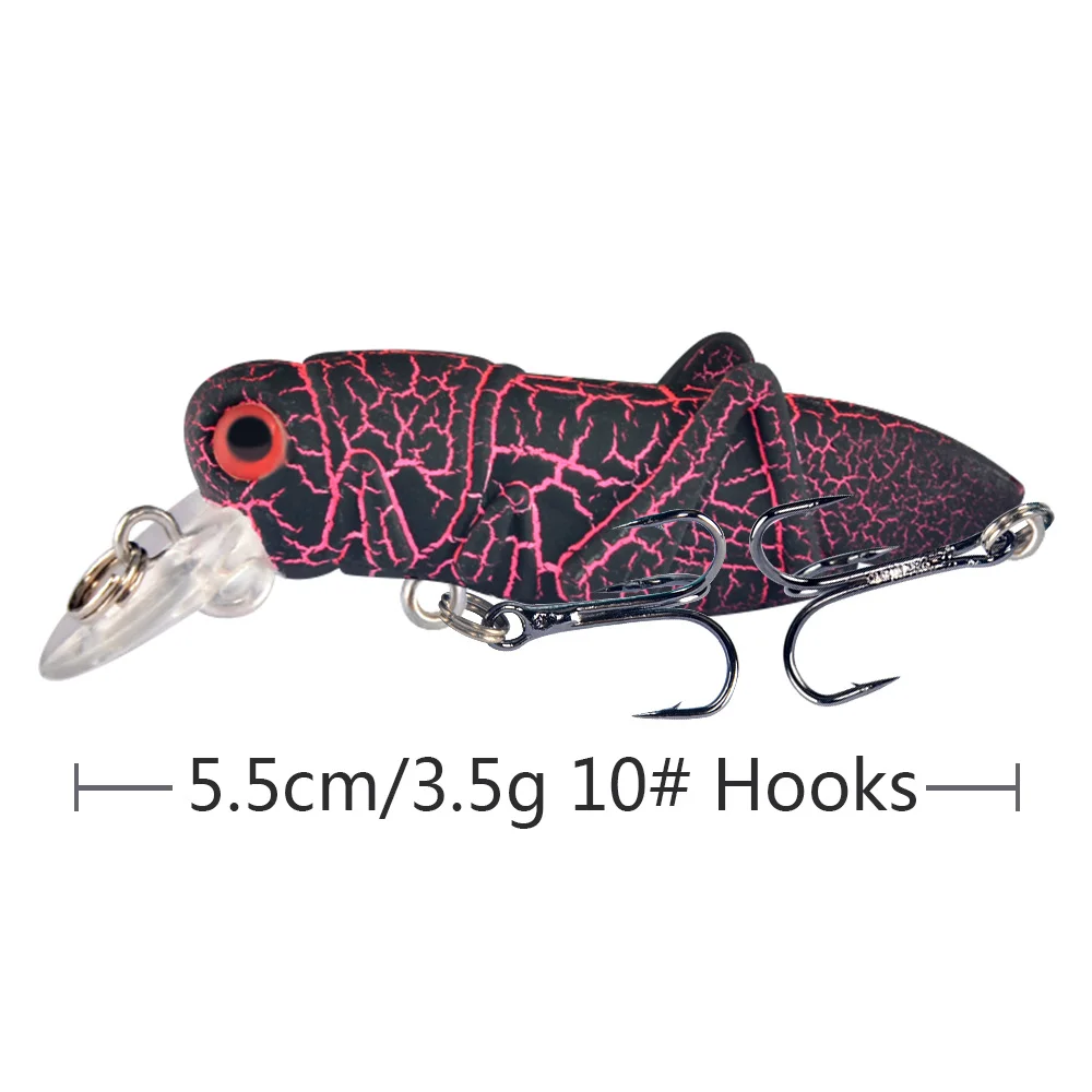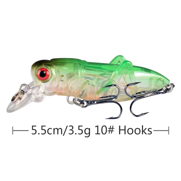 The 5.5cm 3.5g floating grasshopper lure is designed to attract surface-feeding fish, including bass and trout. Its lifelike grasshopper design and noise-producing features make it an excellent choice for both shallow water and surface fishing.