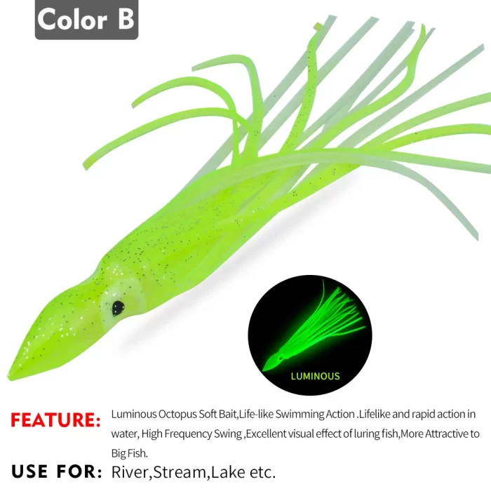 Introducing the Multifunctional Luminous Octopus Soft Lure, expertly crafted for avid anglers. Made from high-quality silicone, this lure offers exceptional flexibility and durability. Its innovative luminous design emits a captivating glow in the water, effectively attracting a wide variety of fish, particularly in low-light conditions.