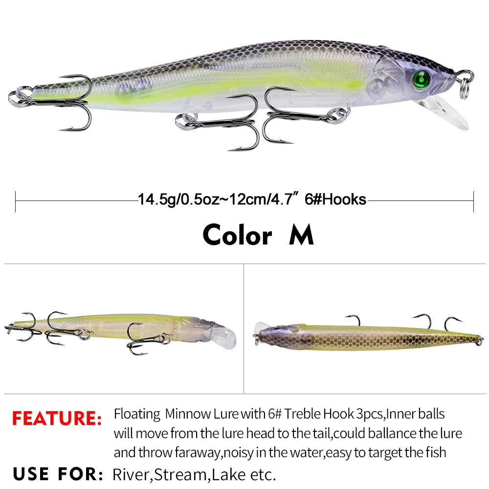 Engineered for high-performance fishing, the Floating Minnow Lure combines realistic design, internal weight balancing, and premium components to help you land more fish with less effort. At 12 cm and 14.5 g, this lure is perfectly weighted and sized for versatile casting and targeting a wide range of freshwater game fish.