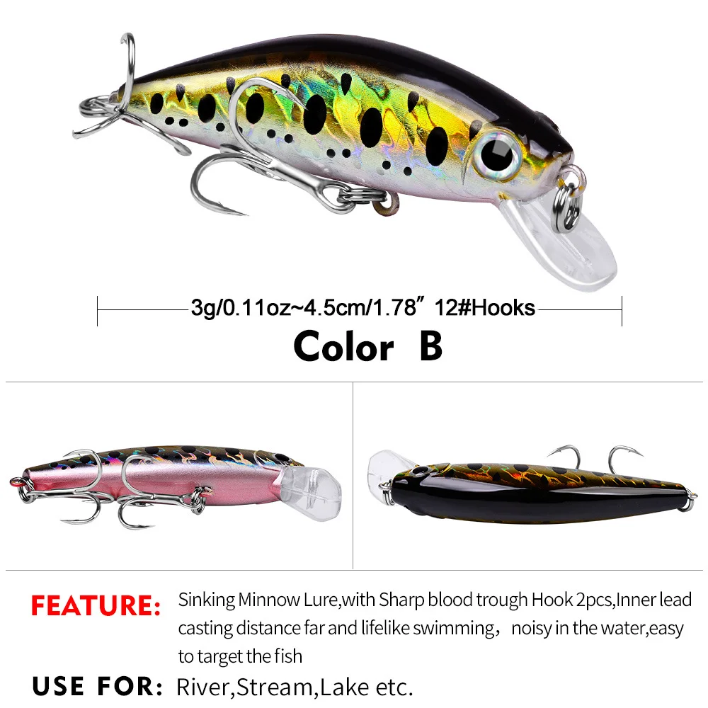 Enhance your angling success with our high-performance Minnow Sinking Lure, expertly designed for professional and recreational anglers alike. Equipped with realistic 3D lifelike eyes, vivid laser skin, and sharp treble hooks, this lure mimics real fish to provoke aggressive strikes from predatory species. Whether you’re fishing in rivers, streams, or lakes, this minnow lure ensures superior performance with far casting distance and a lifelike swimming action.
