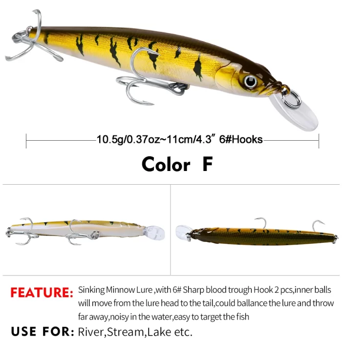 Premium Sinking Minnow Fishing Lure – 10.5g, 11cm, 6# Treble Hooks, Realistic 3D Eyes, Internal Ball Bearing for Accurate Casting – Ideal for River, Lake, and Stream Fishing